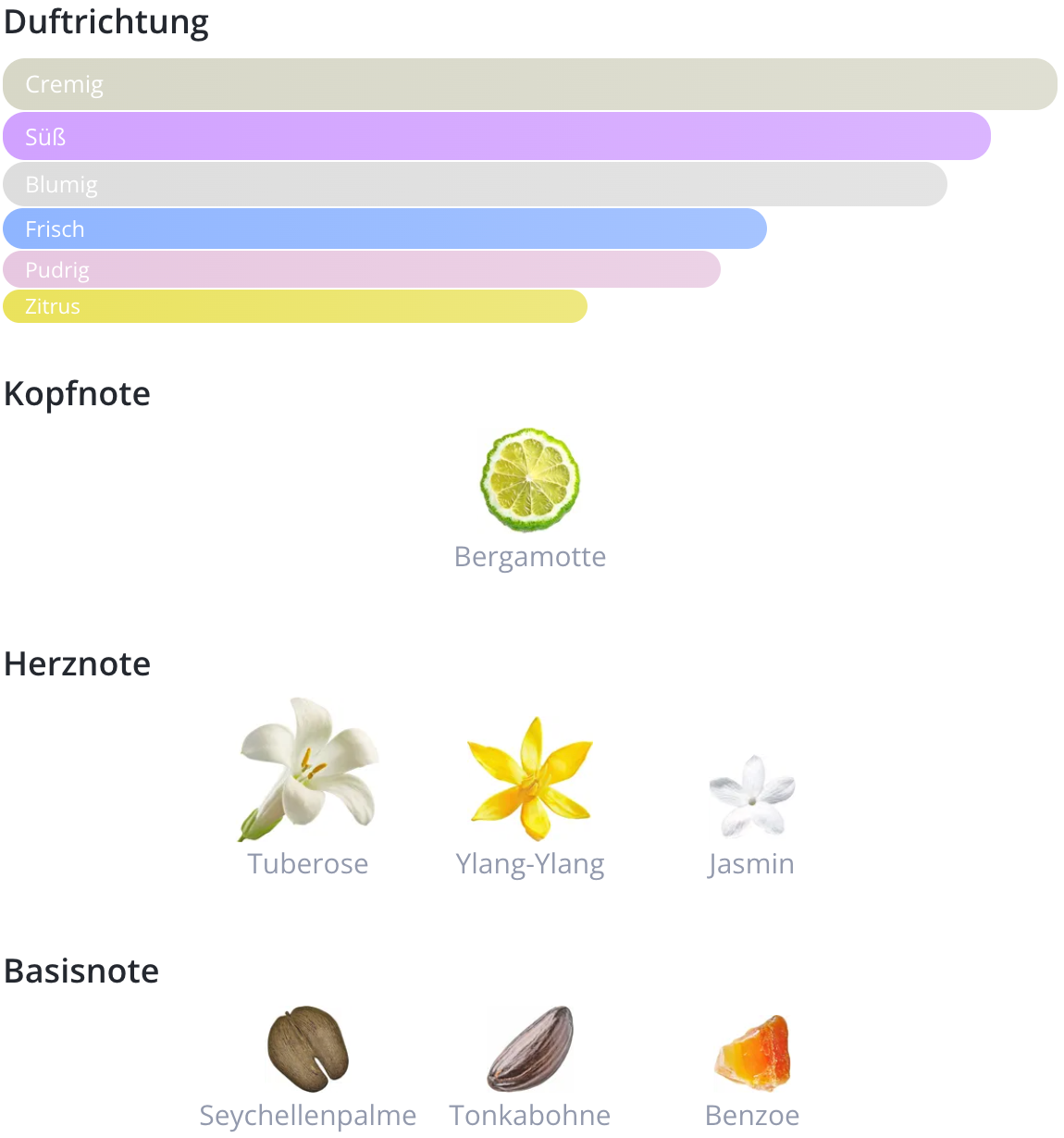 Basisnoten: Kokosmilch, Amber, Tonkabohne, Benzoin